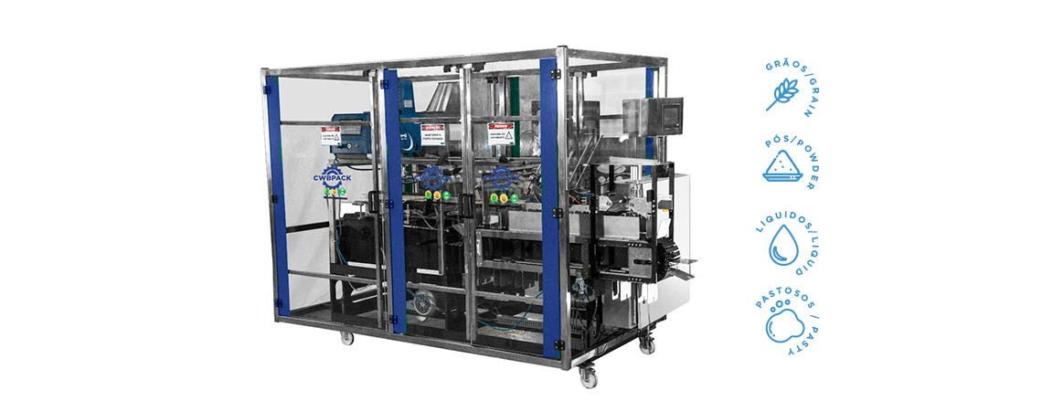Equipamento elaborado para abrir, encher e colar caixas de papel, trabalhando no modelo bag in box.